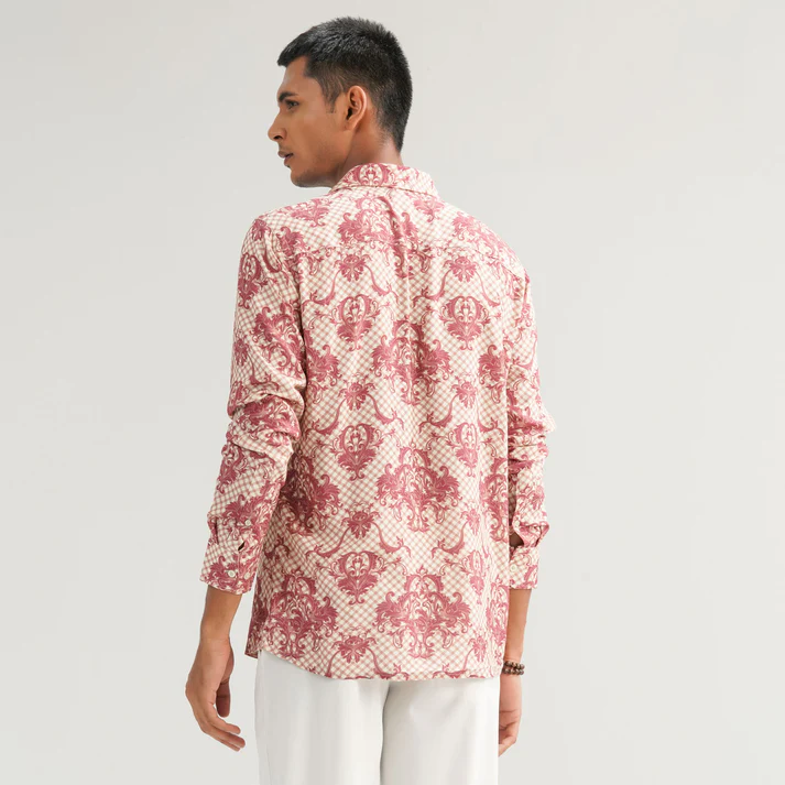 Stylish men’s casual shirt in AOP cream, featuring an elegant damask motif for a timeless and refined look. Crafted from soft 100% viscose slub fabric, it ensures a lightweight and breathable feel. Designed with a regular collar, box placket, and DTM body plastic buttons, this shirt blends comfort with modern style—perfect for summer outings or casual occasions.